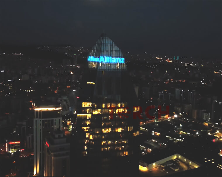 LED mesh display screen project in Allianz Tower, Turkey Torchvisual flexible mesh screen applied in Allianz Tower. We customized long LED strips round the building facade, installed from inside, do not affect the building orignal apperance, and make it see-through transparent media facade.